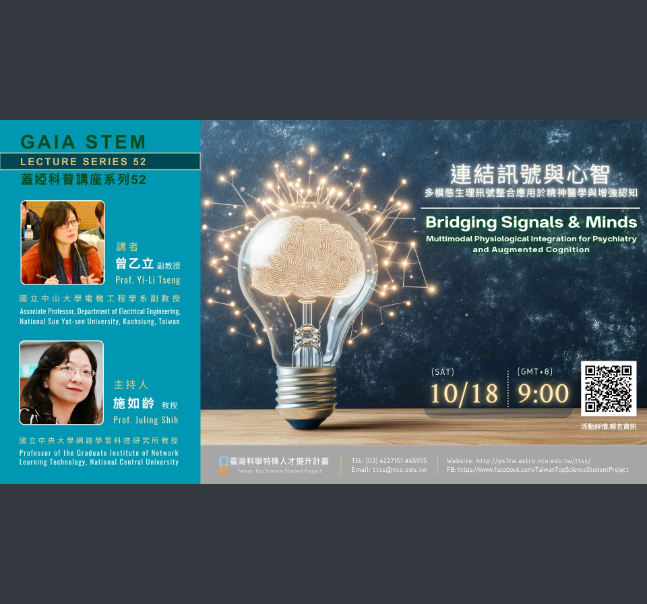 中央大學訂於114年10月18日辦理線上講座:《蓋婭科普講座系列 52》—— 「連結訊號與心智:多模態生理訊號整合應用於精神醫學與增強認知」,請自行報名參加。