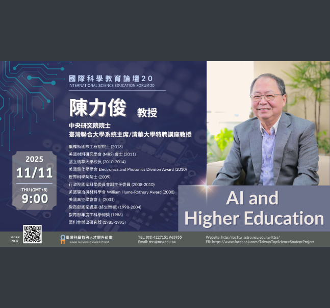 國立中央大學訂於114年11月11日辦理線上講座:《國際科學教育論壇系列20》—— 「AI and Higher Education」,請自有興趣師生自行報名參加。Post author:tngsequip2Post published:2025-10-15Post category:00.一般訊息 / 02.教務處 / A.發布單位 / B.文章分類 / 設備組一、旨揭活動主題為「第七屆衛星科學工作坊暨臺灣太空科學聯盟學生日」,邀請各校教授、各企業人士來校分享;誠摯邀請您參與本次 TSU 學生日活動,期能促進不同年齡層與背景學生之間的交流與合作,並為對太空、航太及相關產業有興趣的學生提供更深入的認識與實際體驗機會。二、活動頁面:https://twspaceunion.org/tsu-workshop7-sd/。三、即日起開放報名至本年10月17日(星期五)止,報名網址:https://forms.gle/yrRuVPquP15jKdr29中央大學-1下載 Post Views: 34Read more articles上一篇文章國立中央大學訂於(114)年10月26日(星期日)09:00~18:00,於研究綜合大樓暨大禮堂(教研大樓)和羅家倫講堂舉辦「第七屆衛星科學工作坊暨臺灣太空科學聯盟學生日」活動(海報如附件),請自行報名參加。下一篇文章【轉知】社團法人中華民國學習障礙協會辦理「超越自己 幸福繪愛~Love to Draw~學習障礙者聯合畫展」畫作徵件活動