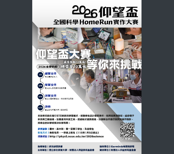 國立彰化師範大學辦理「2026仰望盃全國科學HomeRun實作大賽」,請有興趣同學自行辦理報名參加Post author:tngsequip2Post published:2025-10-15Post category:00.一般訊息 / 02.教務處 / A.發布單位 / B.文章分類 / 設備組一、為鼓勵學生進行設計思考與專題實作,並推廣STEM教育中自然科學領域之學習與應用,特與財團法人仰望教育基金會共同辦理競賽。二、「2026仰望盃全國科學HomeRun實作大賽」訂於115年4月25日(星期六)假國立彰化師範大學舉行。三、該競賽即日起受理報名,報名截止日期為115年1月5日(星期一),相關實施辦法請參閱附件。四、檢附競賽手冊及海報乙份,請惠予公告並鼓勵參與。彰化師大下載師範大學2下載 Post Views: 38Read more articles上一篇文章財團法人德慈生活教育基金會清寒及身心障礙學生獎助學金~114.11.10止下一篇文章【師生活動】臺南女中高優計畫戶外教育活動 「攀樹活動體驗」