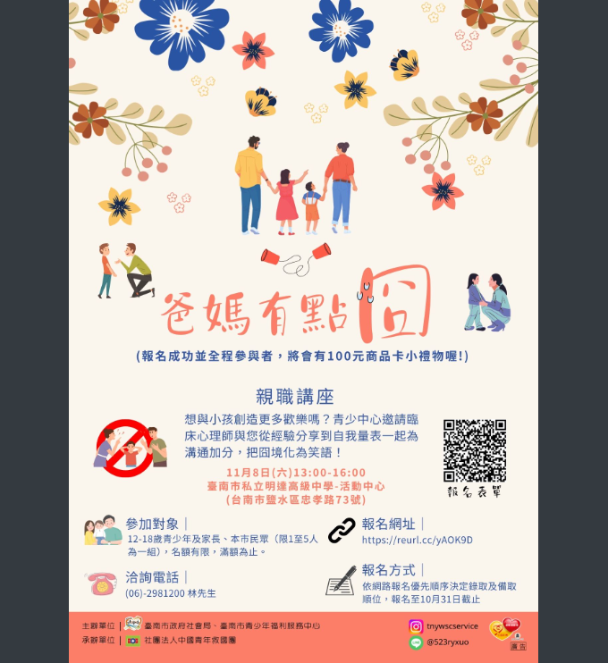 【轉知】臺南市政府社會局青少年福利服務中心「爸媽有點囧」親職講座