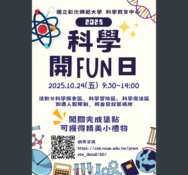 國立大學校慶將舉辦「2025年科學開Fun日活動」,開放該校理學院教師研究室提供參觀體驗,並同時辦理科趣攤位闖關活動,請有興趣師生自行報名參加。Post author:tngsequip2Post published:2025-10-21Post category:00.一般訊息 / 02.教務處 / B.文章分類 / 設備組一、藉此次活動將引導同學對基礎科學之興趣,進而瞭解科學的奧妙。二、該次活動分「團體報名」及「個人報名」,歡迎各級學校以團體報名方式。三、團體報名:https://forms.gle/ATkQHNkCBVqLDApg7四、個人報名:一律現場報名。五、活動詳情網址:https://cse.ncue.edu.tw/promote_detail/60/下載科學館下載 Post Views: 51Read more articles上一篇文章公告本校114學年度教師評審委員會家長代表名單下一篇文章中華數學協會為推廣數學,謹訂於2026年1月4日(星期日)舉辦「WMI世界數學邀請賽-2026臺灣選拔賽」,請 本校公告並推薦學生參加競賽,請自行報名參加。