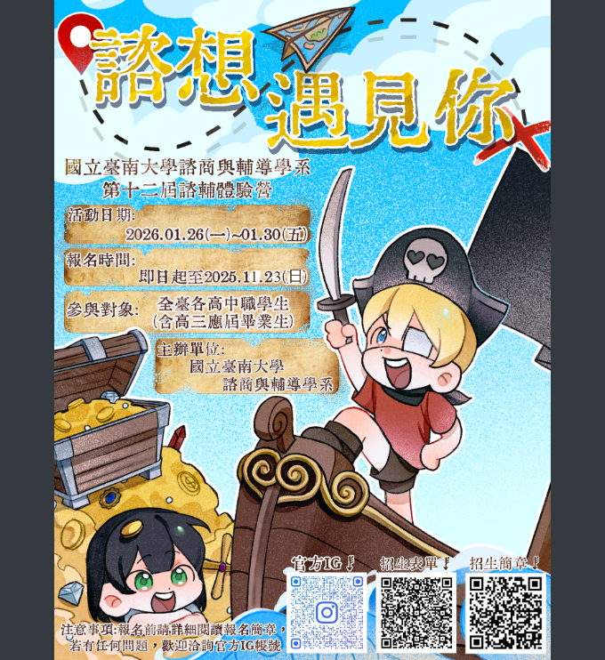 一、活動名稱:臺南大學第十二屆諮輔體驗營-諮想遇見你。