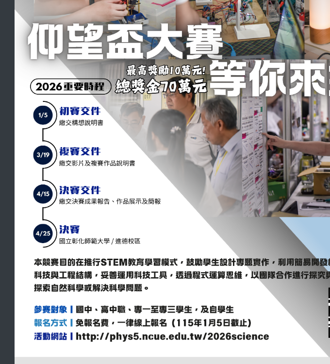 【學生活動】國立彰化師範大學辦理「2026仰望盃全國科學HomeRun實作大賽」Post author:tngsequipPost published:2025-11-05Post category:02.學生活動 / 設備組說明簡章下載 Post Views: 56Read more articles上一篇文章115學年度中國文化大學日間學士班特殊選才下一篇文章【教師研習】國立清華大學辦理114學年度「十二年國民基本教育原住民族文化科學模組製作研習班」活動