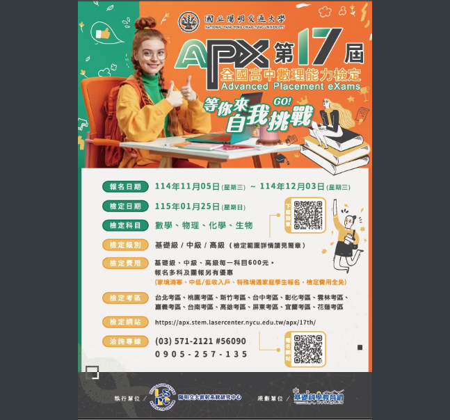 十二、檢附第十七屆活動海報供參。詳細內容請至APX網站https://apx.stem.lasercenter.nycu.edu.tw/apx/17th/ 查詢、報名,或洽APX檢定聯絡窗口:0905-257-135,(03)571-2121#56090。