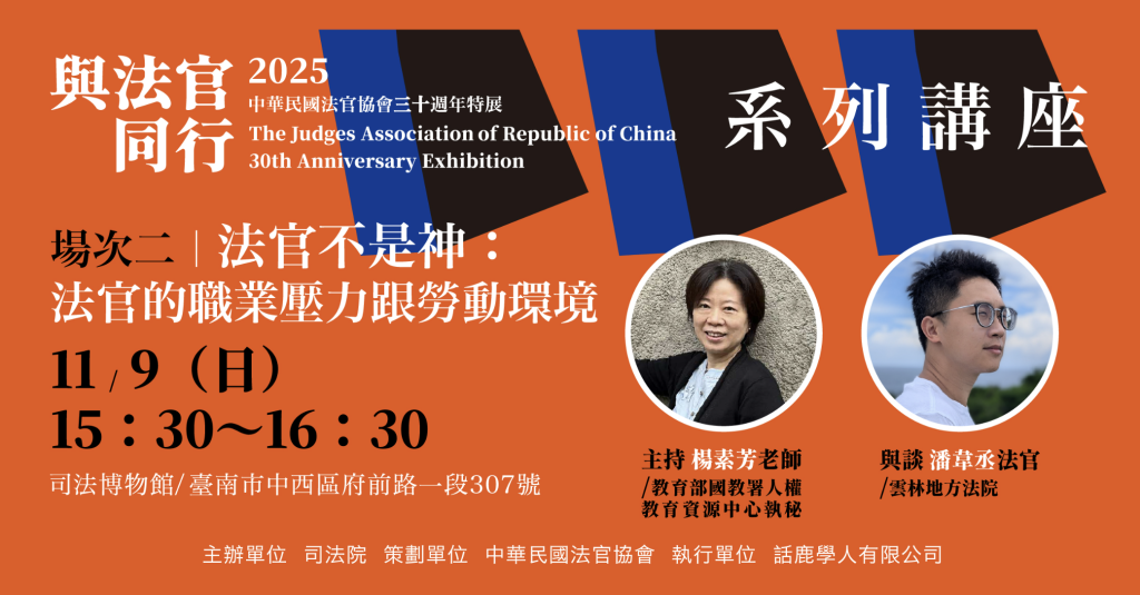 中華民國法官協會今年成立30週年,司法院於司法博物館舉辦「與法官同行:中華民國法官協會30週年特展」,希望邀請大家一同認識司法。11月9日講座邀請法官現身說法,透過實務分享,走進法官真實日常。