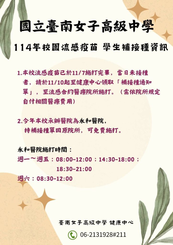 校園流感疫苗補接種資訊Post author:tngssaniPost published:2025-11-07Post category:_置頂公告 / 02.學生活動 / 03.學務處 / 衛生組關於補接種資訊,請參閱下方圖片 Post Views: 64Read more articles上一篇文章115學年度實踐大學特殊選才招生資訊下一篇文章[教師資訊] 永仁高中 辦理「Open Your Mind—SEL技巧融入教學」教師增能工作坊