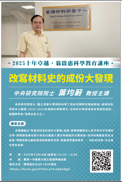 一、為啟發國高中青年學子對材料科學與前沿科技的興趣,增進對創新研究之理解,本校特邀請中央研究院院士、2024~2025年總統科學獎得主-葉均蔚教授蒞臨演講。