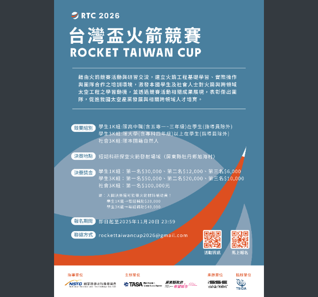 國家太空中心辦理「2026台灣盃火箭競賽」,即日起至本(114)年11月20日止開放線上報名,有興趣同學自行報名參加。