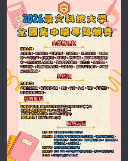 轉知景文科大辦理2026全國高中職專題競賽Post author:tngsreaderPost published:2025-11-24Post category:學生競賽 / 讀者服務組請參閱來文、活動計畫書與海報,有意參加同學請自行報名,如有疑問請逕洽主辦單位。來文-景文科技大學2026全國高中職專題競賽下載活動計畫書-景文科技大學2026全國高中職專題競賽活動計畫書下載 Post Views: 30Read more articles上一篇文章轉知金門大學國際暨大陸事務學系辦理「全球脈動世界觀察」徵文計畫下一篇文章公告114年度經費請購截止核銷日期