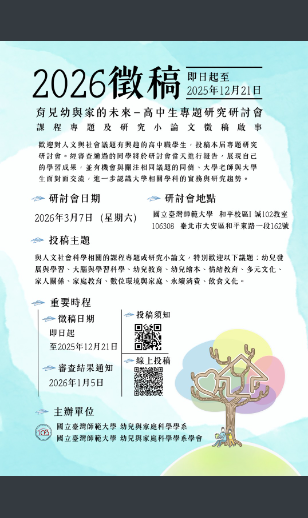 轉知台師大幼兒與家庭科學學系辦理「育見幼與家的未來-高中生專題研究研討會」Post author:tngsreaderPost published:2025-11-24Post category:學生競賽 / 讀者服務組請參閱來文與海報,有意參加請自行報名,如有疑問,請逕洽主辦單位。來文-台師大幼兒與家庭科學學系將於115年3月7日舉辦高中生專題研究研討會下載 Post Views: 27Read more articles上一篇文章【轉知】教育部來函公益財團法人日本台灣交流協會台北事務所擬招募我國高中生赴日留學事下一篇文章轉知金門大學國際暨大陸事務學系辦理「全球脈動世界觀察」徵文計畫