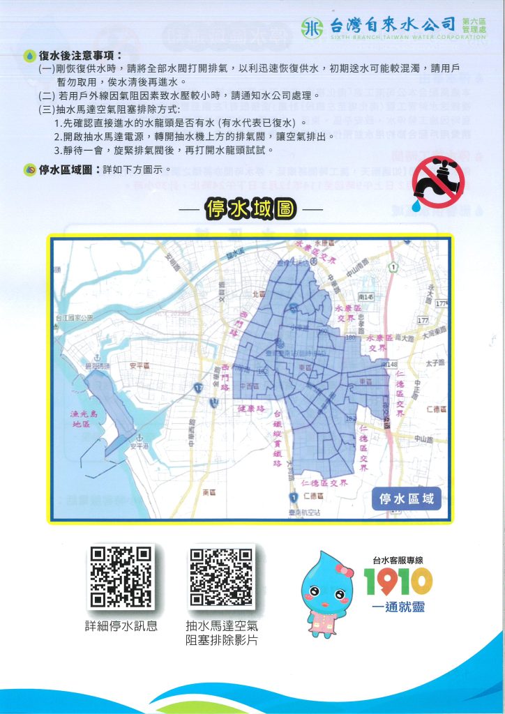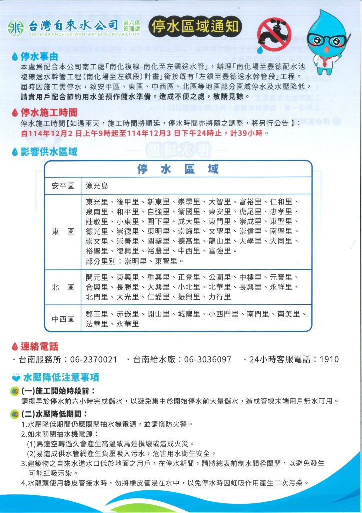 公告:114年12月2日9:00至12月3日24:00停水39小時Post author:tngsmaintPost published:2025-11-26Post category:_置頂公告 / 05.總務處 / 庶務組台灣自來水公司因送水幹道施工,通知將於114年12月2日9:00至12月3日24:00停水39小時,詳如停水通知單。 Post Views: 120Read more articles上一篇文章114學年度第一學期 第7次行政會報會議紀錄(1141110)下一篇文章轉~國民年金保險被保險人暨未參加相關社會保險之我國籍新生兒之生母生育補助要點
