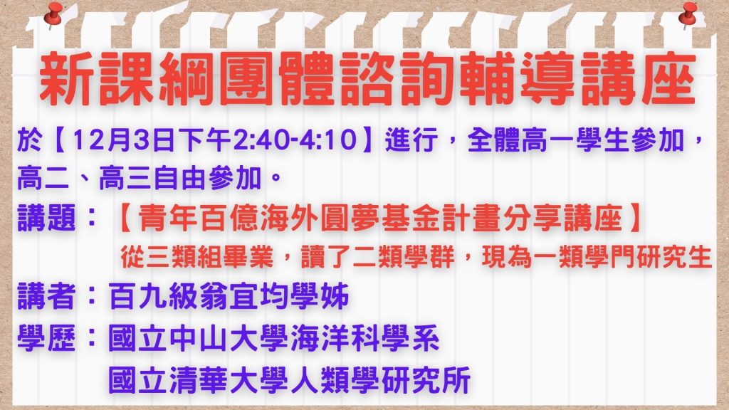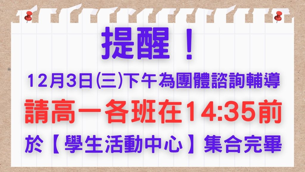 【團體諮詢輔導通知】請高一同學12/3(三)14:40~16:10至本校活動中心參與。Post author:tngsregi4Post published:2025-11-27Post category:00.一般訊息 / 02.教務處 Post Views: 50Tags: 學習歷程Read more articles上一篇文章【反毒活動】轉知中國信託反毒教育基金會共同辦理「機智拒毒生活—校園巡迴特展」活動。下一篇文章【反毒公告】函轉衛生福利部自114年11月14日起廢止「首創見真股份有限公司」濫用藥物尿液檢驗機構認證