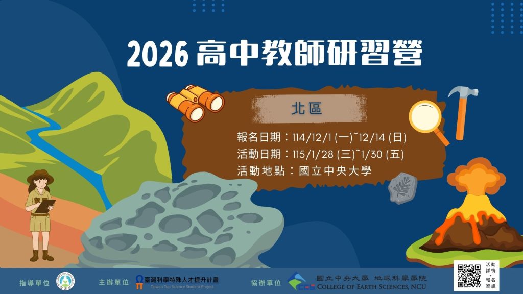 【跨領域】國立中央大學:「2026高中教師研習營」Post author:tngsteach3Post published:2025-11-28Post category:03.教師活動 / 教學組 / 教師研習※詳細內容如附件所示,請參照。▼建議1. 有報名研習之教師,會另再簽予公假。2. 請Email教學組teach3索取。「2026高中教師研習營01下載「2026高中教師研習營02下載 Post Views: 45Read more articles上一篇文章【假日自習】114年11月29-30日假日自習開放下一篇文章公告本校114年度職員第1次甄選正備取人員名單