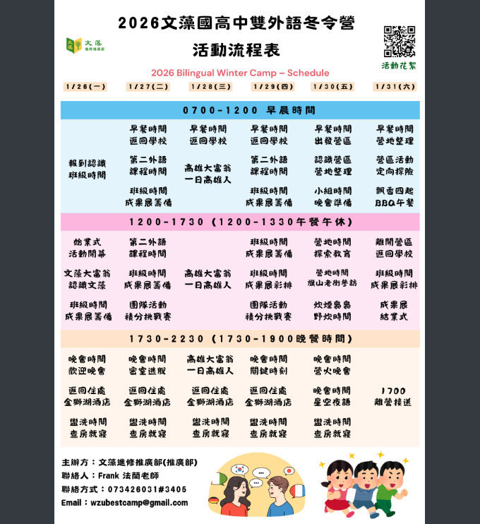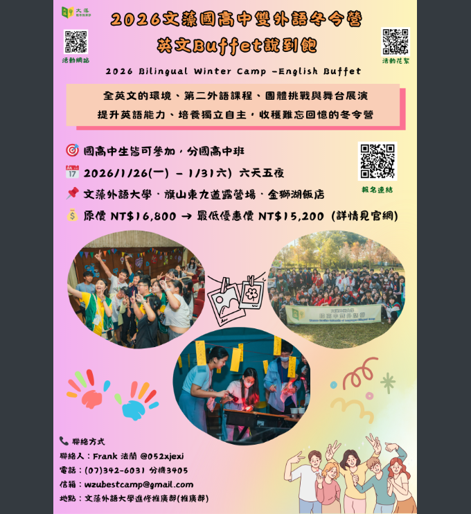 【轉知】文藻學校財團法人文藻外語大學辦理2026文藻國高中雙外語冬令營Post author:tngscounselPost published:2025-12-02Post category:02.學生活動 / 學生營隊【轉知】文藻學校財團法人文藻外語大學辦理2026文藻國高中雙外語冬令營說明:一、時間:民國115年1月26日(一)至1月31日(六),共6天5夜。二、地點:本校、高雄市區及旗山東九道露營場。三、活動對象:國中一至三年級學生、高中一至三年級學生。四、活動人數:100人/梯次,額滿為止。五、詳情可至本校進修推廣部網頁查詢:https://dee.wzu.edu.tw/Course/3900,或洽專線(07)3458212。 Post Views: 29Read more articles上一篇文章敬邀聆賞114/12/11(四)【啊!音樂是多麼美麗的藝術!】臺南女中成果展暨兩校聯合展演下一篇文章國立臺灣師範大學數學系訂於115年1月26日至1月28日舉辦「2026年資優數學研習營(GMC)」,請自行報名參加。