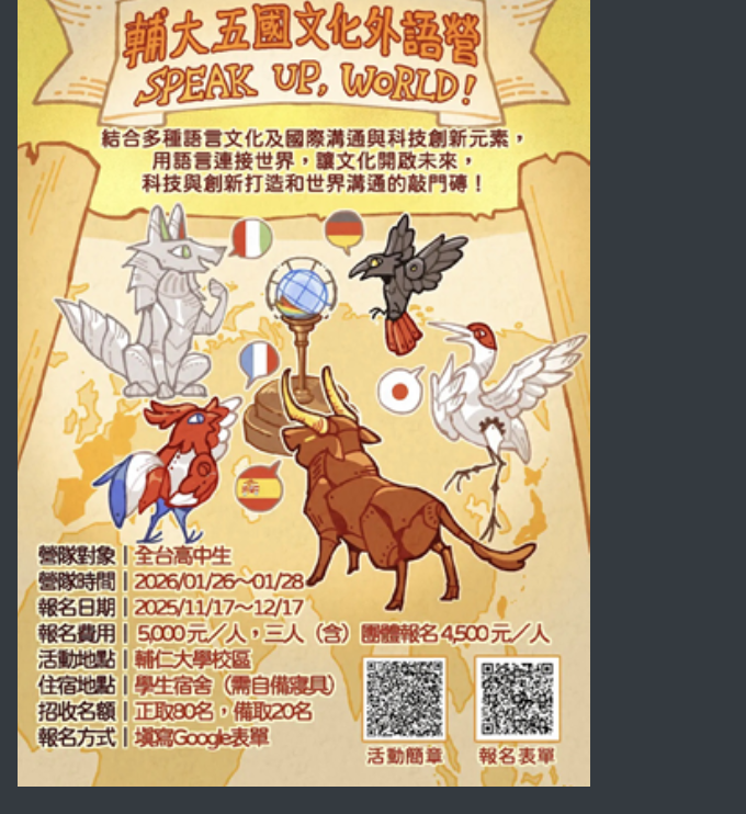 【轉知】輔仁大學學校財團法人輔仁大學「2026 Speak Up, World! 五國文化外語營」