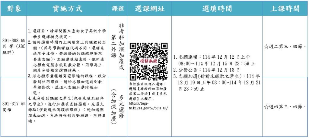 【高三同學】114學年度第二學期多元選修(含加深加廣)、非考科加深加廣或第二外語選課時間Post author:tngsteach2Post published:2025-12-10Post category:_置頂公告 / 00.一般訊息 / 02.教務處 / 04.校內課程 / 多元選修課程 / 教學組一、校務系統之選課操作手冊詳見校網選課公告之附檔。二、上課地點將於開課結果確定後,另行公告在校網。三、選課問題可連繫教務處教學組 莊小姐 06-2131928#106或來信teach2@tngs.tn.edu.tw。四、如課程另收材料費和講義費,公告和選課系統之課程查詢雖有註明,但仍依授課老師實際上課為準。五、如忘記密碼,請利用系統上【忘記密碼】功能,系統將會發送 mail 至您紀錄在校務系統內的信箱。(如未設定信箱,則請攜帶身分證明文件至註冊組)。國立臺南女子高級中學學生選課補充規定下載選課操作說明下載11402高三多元選修四34下載11402高三第二外語二34下載 Post Views: 96Read more articles上一篇文章【跨領域】中華大學:第二屆EMI教學研討會下一篇文章【高二同學】114學年度第二學期多元選修(含加深加廣)及彈性課程第一階段選課時間