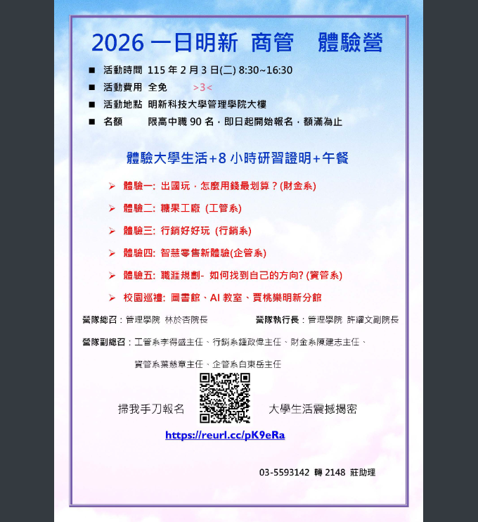 【轉知】明新學校財團法人明新科技大學辦理「2026一日明新商管職涯試煉場」活動