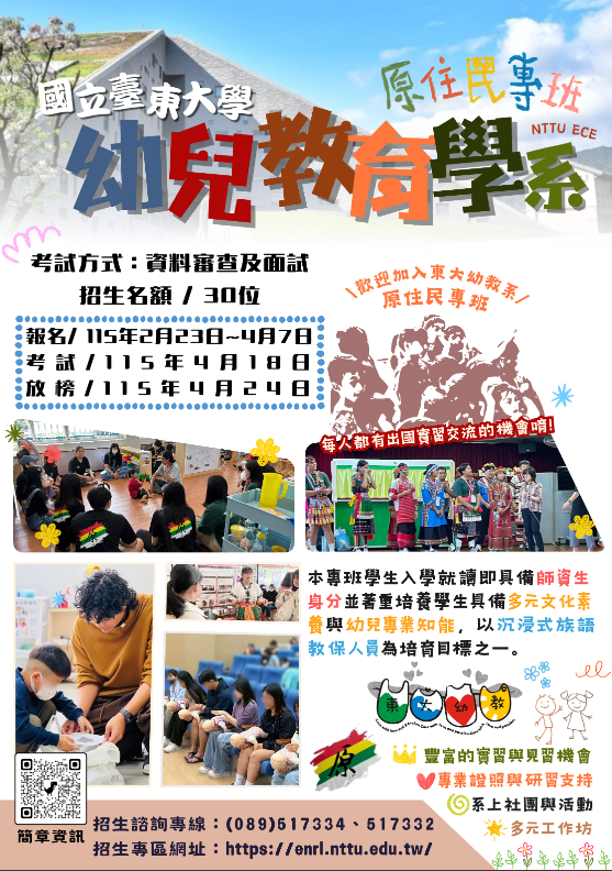 一、檢附本校幼教系原住民專班入學獨立招生考試海報1份,有關招生詳情,請參閱本校招生網頁說明:https://enrl.nttu.edu.tw/p/406-1040-170513,r1246.php?Lang=zh-tw。