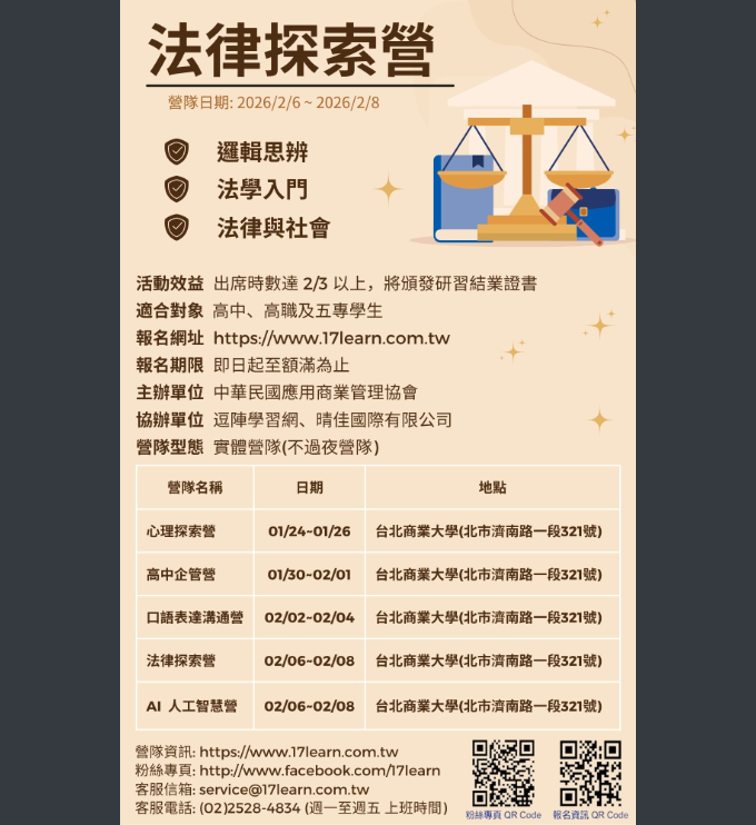 【轉知】晴佳國際有限公司法律探索營-確定開課!!