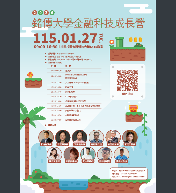 二、請於115年01月02日前,至「銘傳大學金融科技學院」首頁瀏覽活動詳情(https://fintech.mcu.edu.tw/)與報名(https://forms.gle/SrhEunH3F2A5dQVj7)。