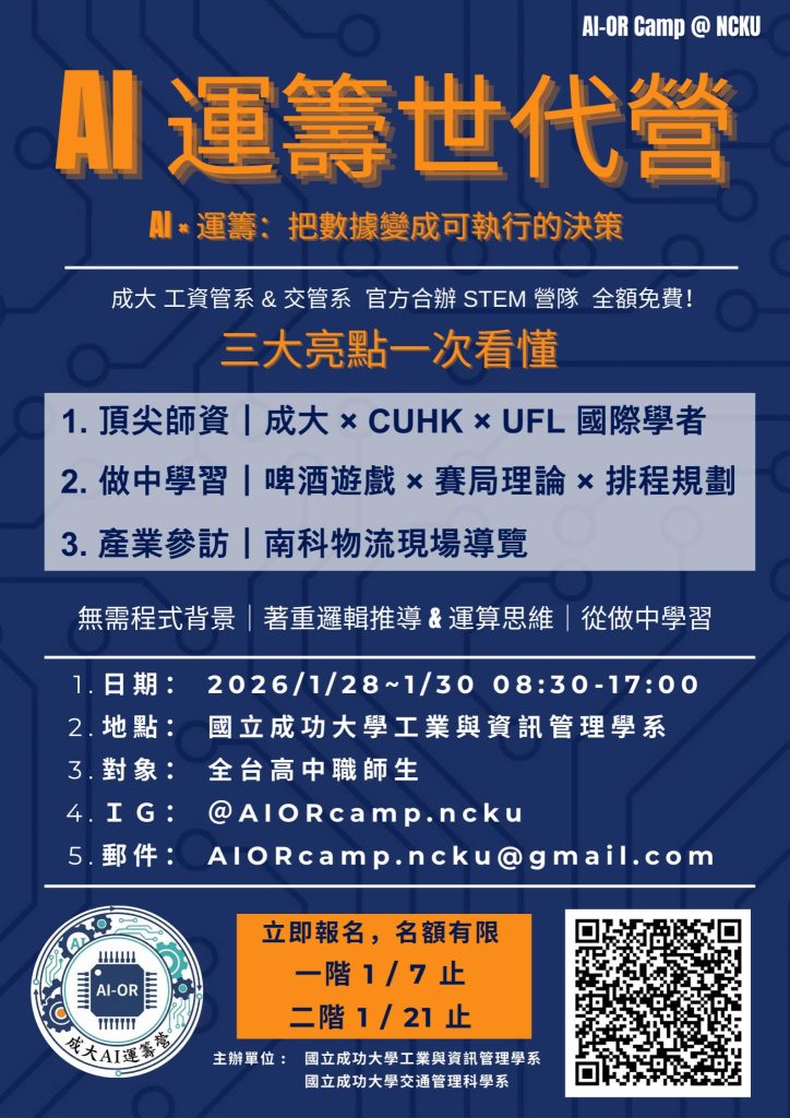 活動宗旨: 在大數據與人工智慧(AI)蓬勃發展的時代,如何將數據轉化為可執行的決策?國立成功大學工業與資訊管理學系攜手交通管理科學系,舉辦為期三日的 「AI 運籌世代營(AI-OR Camp)」。本營隊結合「數據思維」與「管理決策」,透過國際講座、模擬遊戲與企業參訪,引領高中職師生探索運籌管理(Operations Research)的跨域應用。