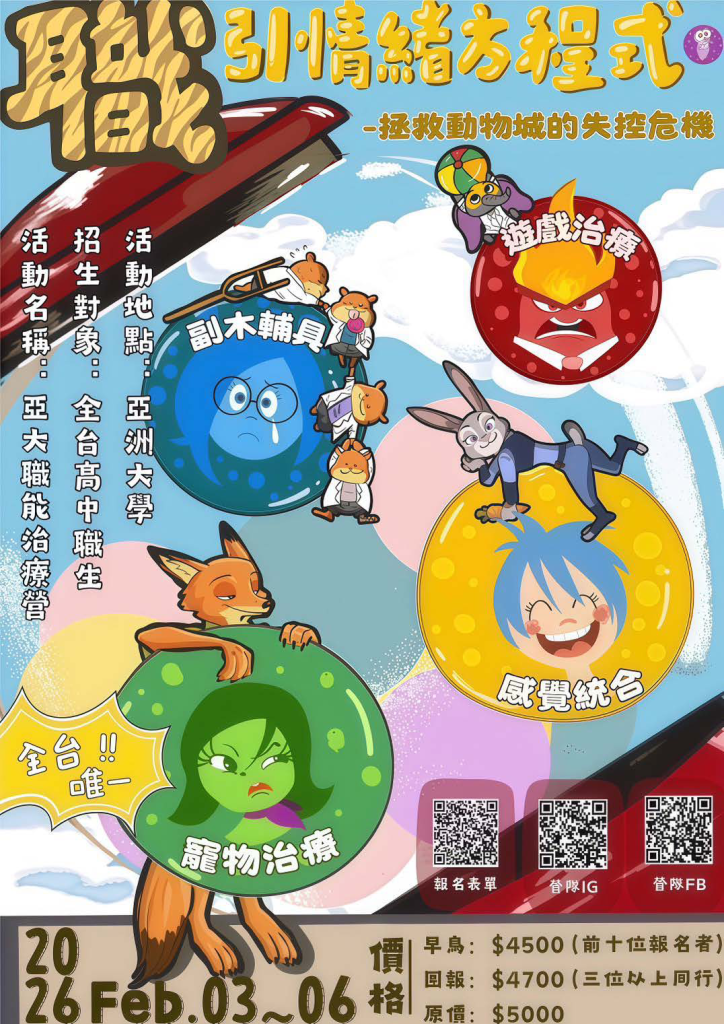 【轉知】亞洲大學醫健學院職能治療學系所舉辦「2026亞洲大學職能治療學系寒假營隊:職引情緒方程式-拯救動物城的失控危機」高中生四天三夜的營隊延長報名