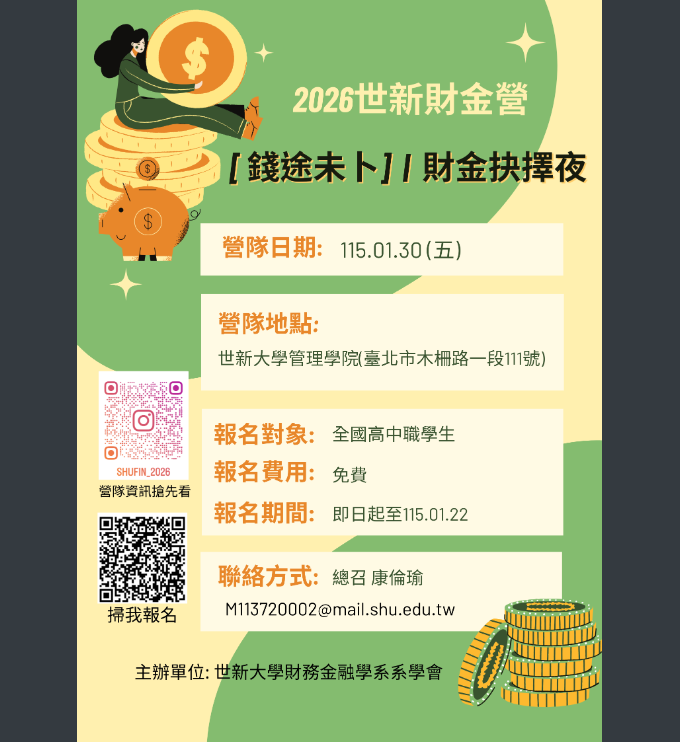【轉知】世新大學財務金融學系辦理「2026世新大學財金營─《錢途未卜》」開始受理報名Post author:tngscounselPost published:2026-01-14Post category:02.學生活動 / 學生營隊【轉知】世新大學財務金融學系辦理「2026世新大學財金營─《錢途未卜》」開始受理報名說明:一、活動時間:115年1月30日(星期五)08:30~18:00。二、活動地點:本校管理學院4樓(臺北市文山區木柵路一段111號)。三、參與對象:有興趣之高中生(活動免報名費)。四、報名日期:即日起至115年1月22日(星期四)截止,相關公告請至本活動Instagram查詢(@shufin_2026)。 Post Views: 29Read more articles上一篇文章【轉知】國立臺灣大學115年3月舉辦「2026年臺大杜鵑花節」下一篇文章【轉知】嘉藥學校財團法人嘉南藥理大學消防科技防災中心辦理建築公共安全及消防相關之推廣教育班招生海報1份