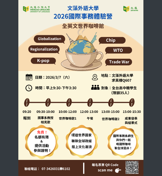 【轉知】文藻外語大學國際事務系舉辦之「2026國際事務體驗營–全英文世界咖啡館」活動訊息
