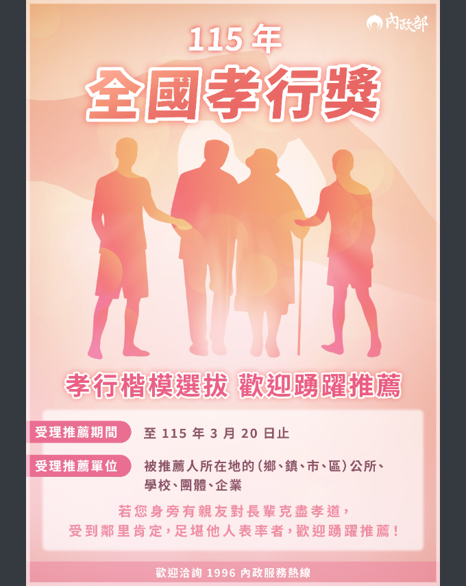 115年全國孝行獎孝行楷模選拔Post author:tngsdisciPost published:2026-01-26Post category:03.學務處 / 訓育組115年全國孝行獎孝行楷模選拔-來文下載 Post Views: 32Read more articles上一篇文章國立臺中教育大學辦理「AI時代的創意發想與實踐」營隊下一篇文章白恐不迷路地圖在地篇分享會—第二場:屏東陳玉貞故事地圖