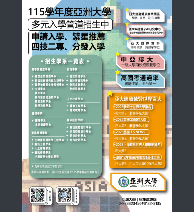【轉知】亞洲大學舉辦「亞洲大學院系特色成果展會暨多元入學管道說明會」