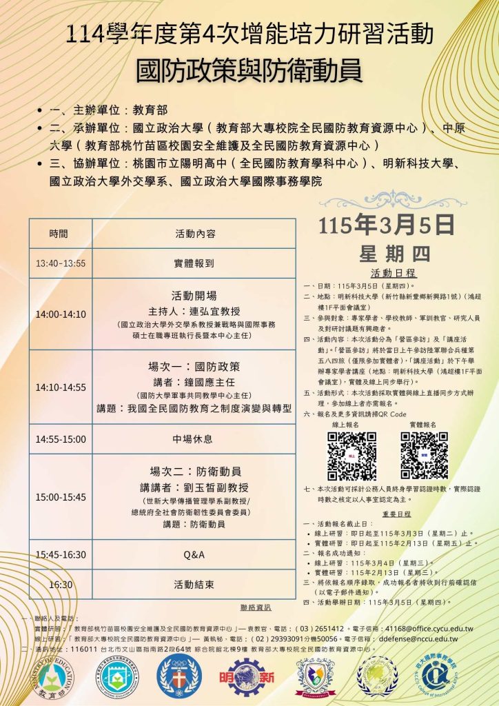 【跨領域】教育部大專校院全民國防教育資源中心114學年度第4次增能培力研習活動Post author:tngsteach3Post published:2026-02-11Post category:02.教務處 / 03.教師活動 / 教學組 / 教師研習※詳細內容如附件所示,請參照。▼建議1. 有報名研習之教師,會另再簽予公假。2. 請Email教學組teach3索取。教育部大專校院全民國防教育資源中心114學年度第4次增能培力研習活動01下載教育部大專校院全民國防教育資源中心114學年度第4次增能培力研習活動02下載 Post Views: 72Read more articles上一篇文章【跨領域】114學年度新興議題與教育新知系列工作坊:SEL 研究與教學實務座談會下一篇文章【高三】115年2月28日(六)大學甄選入學學測選填志願分析講座,歡迎高三家長參加