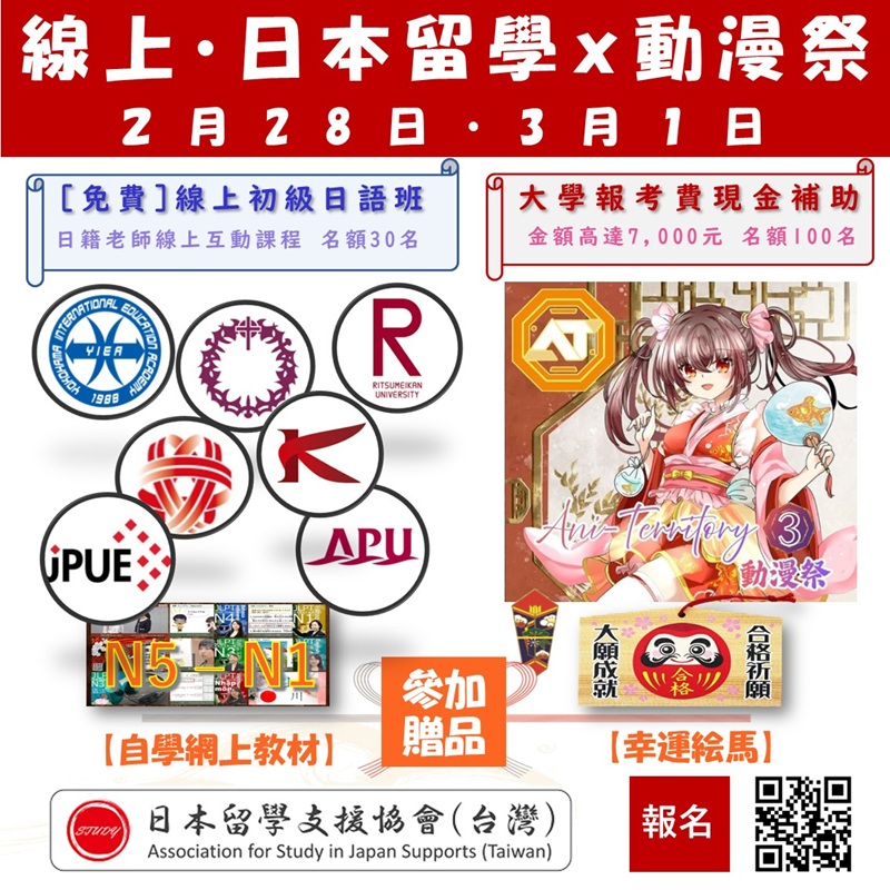 參加贈品 免費・日籍老師線上互動 初級日語班(1個月) 免費・網上日語教材, 合格絵馬 高達 7,000元 日本大學報考補助
