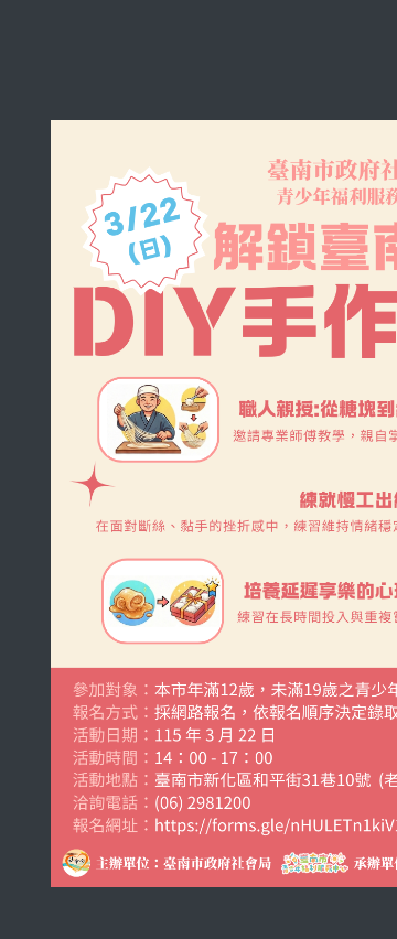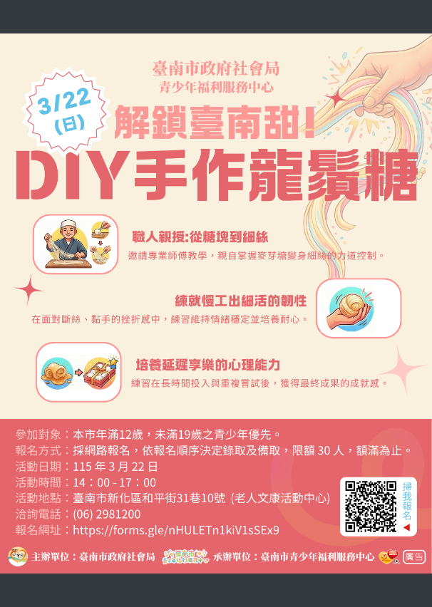 【轉知】青少年福利服務中心「探索體驗教育」及「DIY 手作龍鬚糖」育樂計畫Post author:tngsdisciPost published:2026-02-25Post category:03.學務處 / 訓育組青少年福利服務中心「探索體驗教育」及「DIY手作龍鬚糖」育樂計畫-來文下載青少年福利服務中心「探索體驗教育」及「DIY手作龍鬚糖」育樂計畫2下載 Post Views: 92Read more articles上一篇文章公告本校115學年度校長遴選教師代表名單下一篇文章第十五屆「愛讓世界轉動兒少公益行動」徵選活動訊息