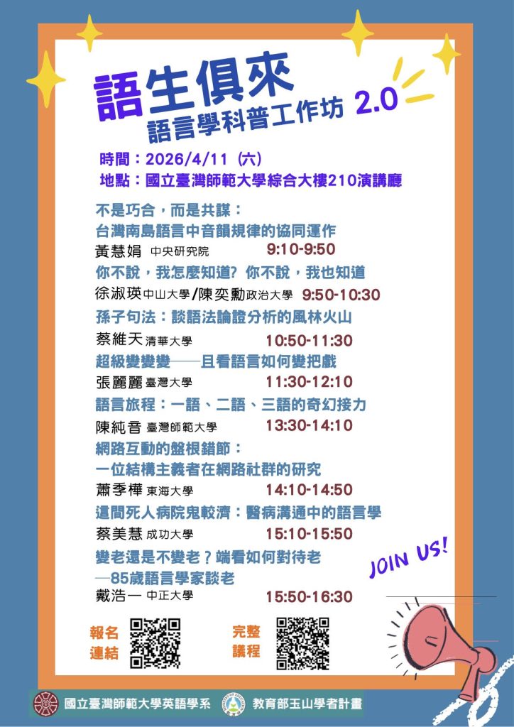 為推廣語言學知識並促進跨域交流,台灣語言學學會與國立臺灣師範大學英語學系合作,將於 2026 年 4 月 11 日(六)舉辦「語生俱來語言學科普工作坊 2.0」(活動網站連結)。