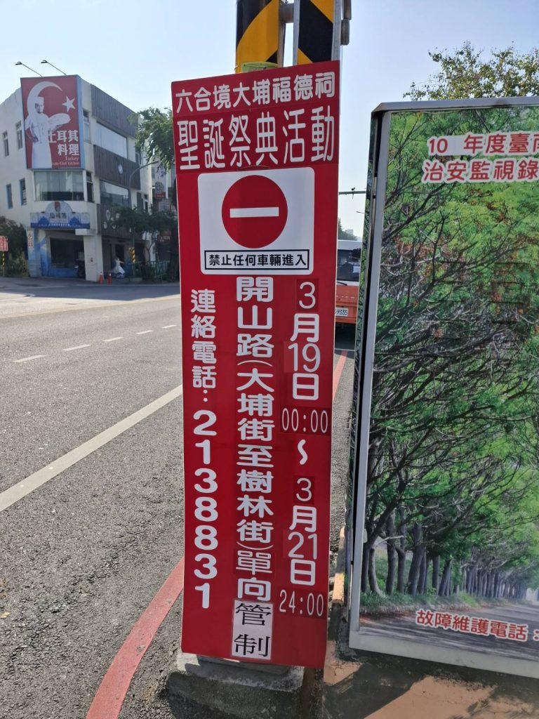 【學生事務】3/19~21開山路單向管制Post author:生輔組長Post published:2026-03-17Post category:_置頂公告 / 生輔組一、六合境大浦福德祠因聖誕祭典活動,自3/19 0時起至3/21 24時止,開山路(大埔街至樹林街)單向管制。二、請同學務必留意交通狀況,以免影響到校時間。 Post Views: 697Tags: 學生事務Read more articles上一篇文章[教師資訊] 臺東高中 辦理114學年度數位前導教師社群研習-「社會情緒學習之SEL進階講座」下一篇文章114學年度第二學期第一次期中考考程表 (0320高三化學修正)