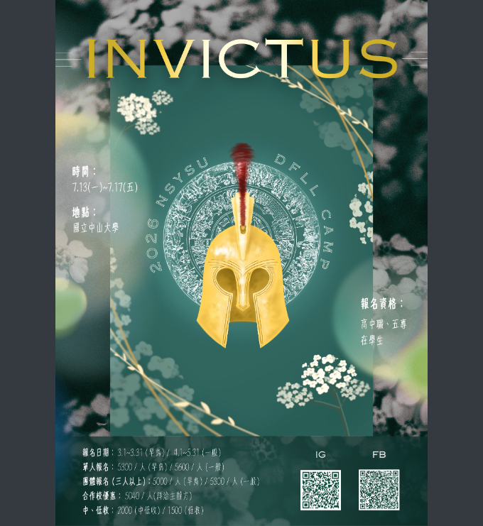 (六)FB粉絲專頁「2026 中山外文營 Invictus 」https://www.facebook.com/share/18SdZJBo7E/?mibextid=wwXIfr