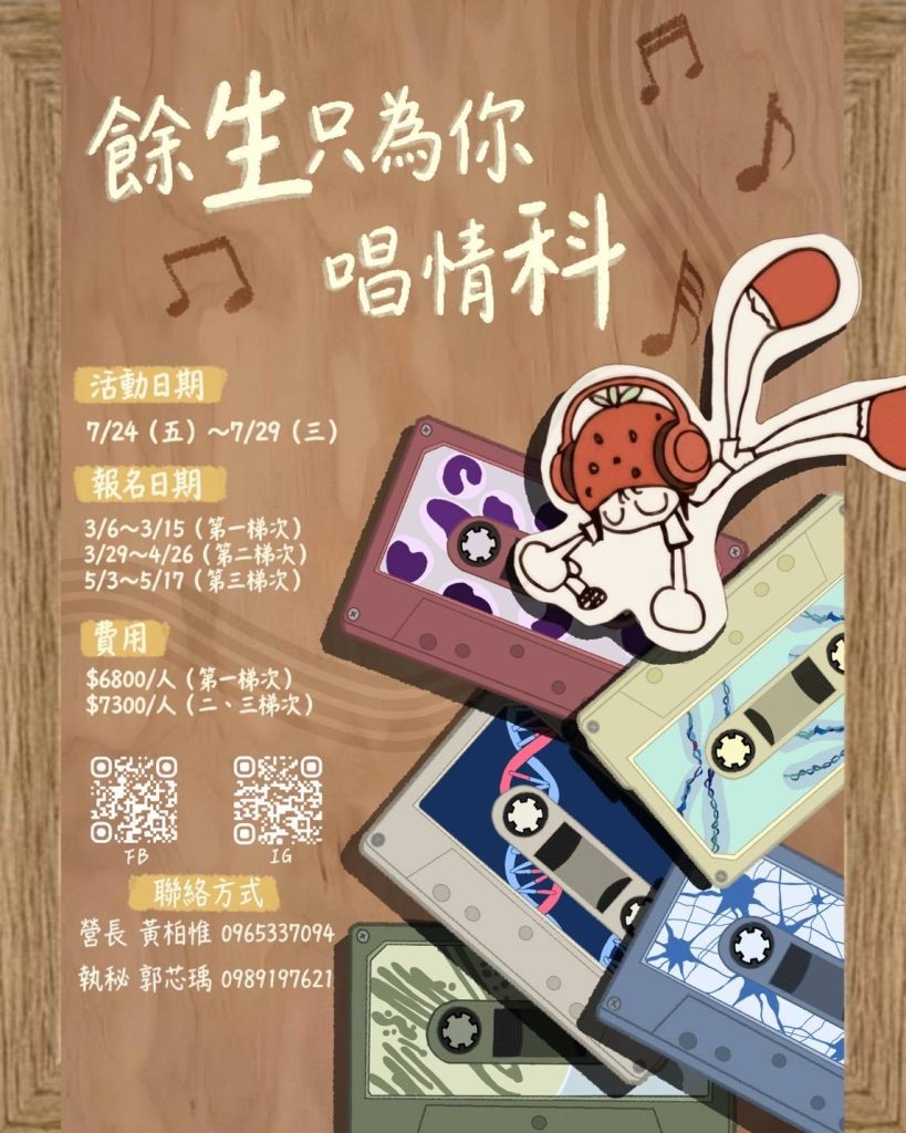 【轉知】清華大學生科營2026宣傳Post author:tngscounselPost published:2026-03-26Post category:02.學生活動 / 學生營隊【轉知】清華大學生科營2026宣傳本營隊將於2026年7月24日至7月29日於國立清華大學生命科學院舉行,為期六天五夜,招收國三升高一至高三升大一之學生。活動內容涵蓋基礎生命科學課程、實驗操作體驗、專題講座及校園生活探索,期望讓學生能夠實際接觸生命科學領域,並提早認識大學學習環境。 Post Views: 64Read more articles上一篇文章【轉知】國立中正大學資工系 2026暑期資工營招生資訊下一篇文章【轉知】2026崑山盃全國高中職專題創新概念競賽