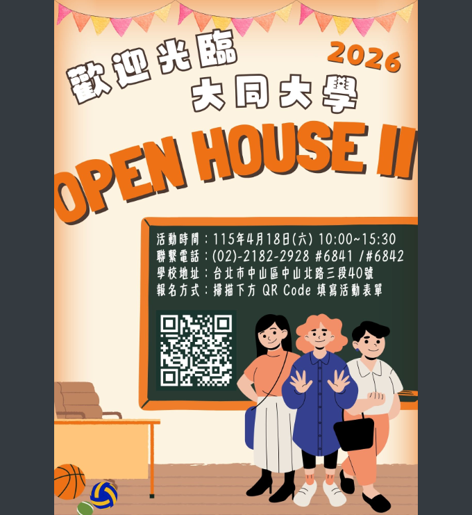 二、為使貴校師生能深入認識本校學系特色,並協助一階通過考生與家長了解各學系二階甄試注意事項,挹注學生選填適合學系,精準規劃大學生涯發展,本校舉辦「歡迎光臨大同大學OPEN HOUSE II」,活動當天校園及全學系皆開放參觀。各學系提供2個參觀時段,安排了豐富多元的導覽解說、實作體驗、教學場域參觀等,歡迎貴校師生及家長蒞臨本校。