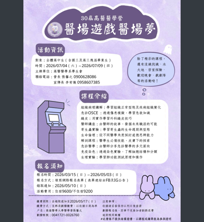 【轉知】高雄醫學大學醫學系學生會擬於115年7月4日(星期六)至7月9日(星期四)舉辦醫學營活動