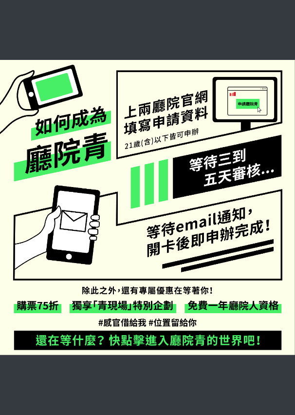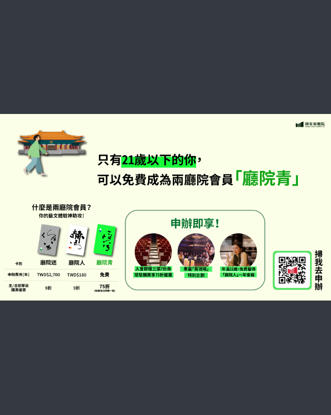 【轉知】國家表演藝術中心國家兩廳院「國家兩廳院青年會 員—廳院青」免費申辦資訊Post author:tngsdisciPost published:2026-04-09Post category:03.學務處 / 訓育組國家表演藝術中心國家兩廳院「國家兩廳院青年會員—廳院青」免費申辦資訊-來文下載國家表演藝術中心國家兩廳院「國家兩廳院青年會員—廳院青」免費申辦資訊下載 Post Views: 30Read more articles上一篇文章【轉知】中國醫藥大學辦理「2026中國醫藥大學杏服醫學服務隊暑期營高中生隊員招募活動」下一篇文章【轉知】景文科技大學旅遊管理系「2026旅遊航空營」活動